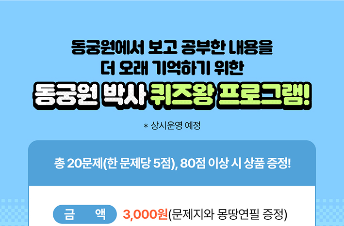 - 동궁원과 신라의 역사에 관한 퀴즈를 눈으로 직접 보며 문제를 풀어보는 체험입니다.