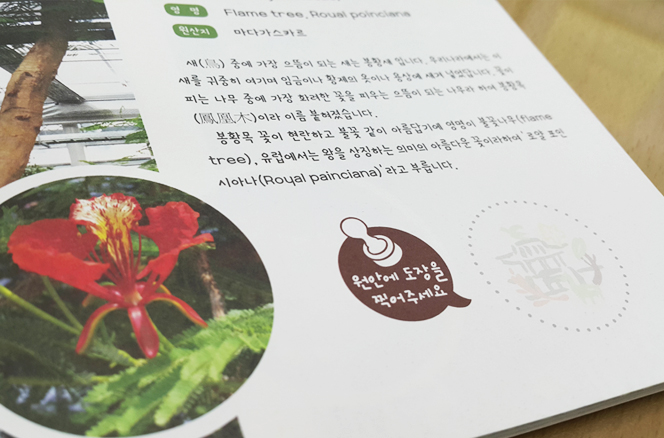 - 동궁식물원 투어북에는 주요식물 스탬프 찍기, 동궁원 신라이야기, 부대시설 안내, 컬러링북 등 4가지 콘텐츠가 담겨있습니다.
