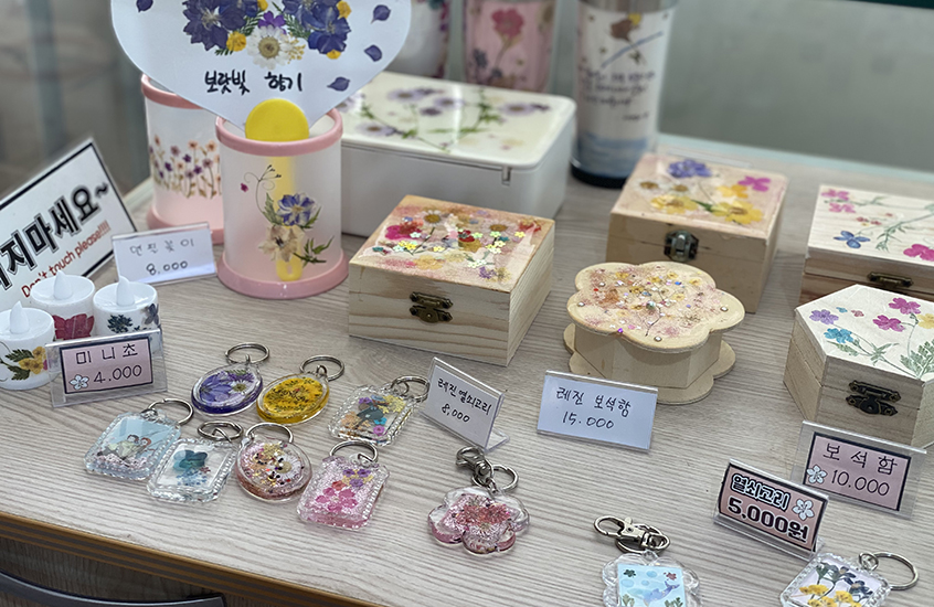 - 꽃의 수분을 제거하고 눌러 말린 평면적 장식의 꽃을 이용하여 여러가지 나만의 소품을 만드는 체험입니다.