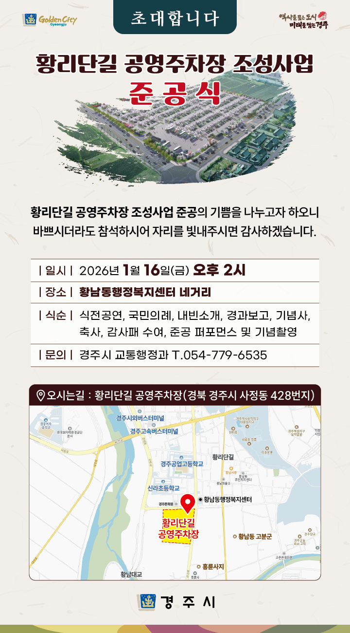 - - 4만 7,248㎡ 규모 894면 확보…보행 중심 관광환경 조성 기대 경주 동부사적지 일원과 황리단길 관광객 증가로 심화된 도심 교통 혼잡을 완화하기 위한 대형 환승주차장이 본격 운영에 들어갔다. 경주시는 관광지와 도심지로 유입되는 차량을 분산하고 교통체계를 정비하기 위해 조성한 황리단길 공영주차장을 지난 3일부터 시민에게 개방했다고 11일 밝혔다. 사정동 428번지 일원에 조성된 황리단길 공영주차장은 4만 7,248㎡ 규모로, 차량 894대를 동시에 수용할 수 있는 대형 환승주차장이다. 이 주차장은 동부사적지와 황리단길을 찾는 관광객 증가로 반복돼 온 도심 주차난과 교통 혼잡을 완화하기 위해 추진됐다. 황리단길 외곽에 대형 환승주차장을 조성해 관광객 차량을 사전에 흡수하고, 보행 중심 관광환경 조성과 교통체계 정비를 함께 도모하는 것이 골자다. 주차장에는 이용객 편의를 위한 83.16㎡ 규모 화장실 1동과 관리동이 설치됐으며, 이용객 안전 확보를 위해 스테인리스 가로등주 82본과 주차관제 시스템도 갖췄다. 야간 이용과 보행 동선을 고려한 안전·편의 시설을 함께 구축한 점이 특징이다. 경주시는 2019년 주차 수급 실태조사와 기본계획 수립을 시작으로 지방재정투자심사, 토지 보상, 도시계획시설 결정, 문화유산 시굴·발굴 조사 등 관련 절차를 단계적으로 진행해 지난해 말 조성 공사를 마무리했다. 준공식은 오는 16일 오후 2시 현장에서 열릴 예정이다. 주낙영 경주시장은 “황리단길 환승주차장은 단순한 주차 공간을 넘어 관광객 편의와 안전, 도심 교통 관리 기능을 함께 갖춘 기반시설”이라며 “교통 질서 개선은 물론 관광도시 경주의 이미지 제고에도 중요한 역할을 하게 될 것”이라고 말했다.