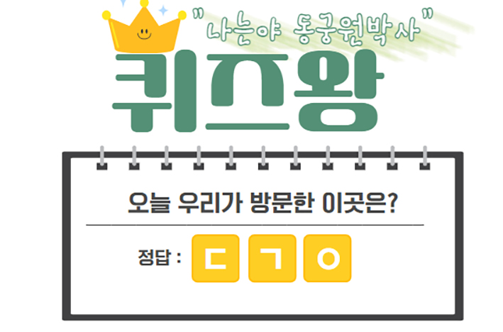 - 동궁원과 신라의 역사에 관한 퀴즈를 눈으로 직접 보며 문제를 풀어보는 체험입니다.