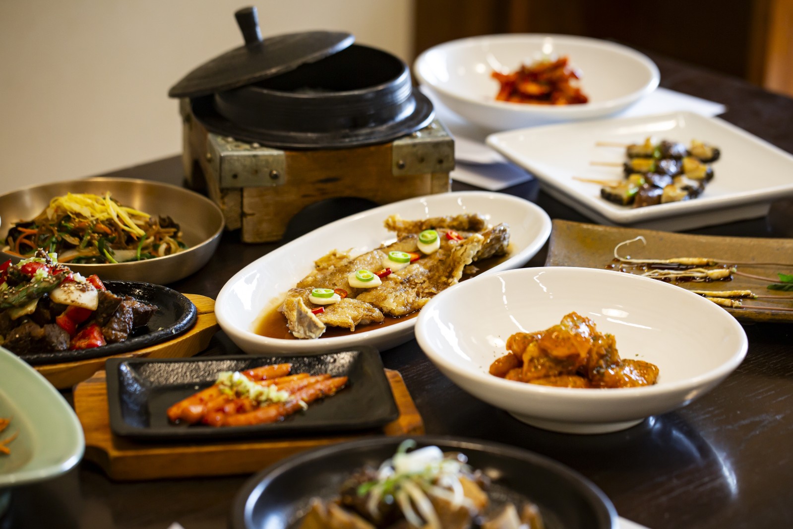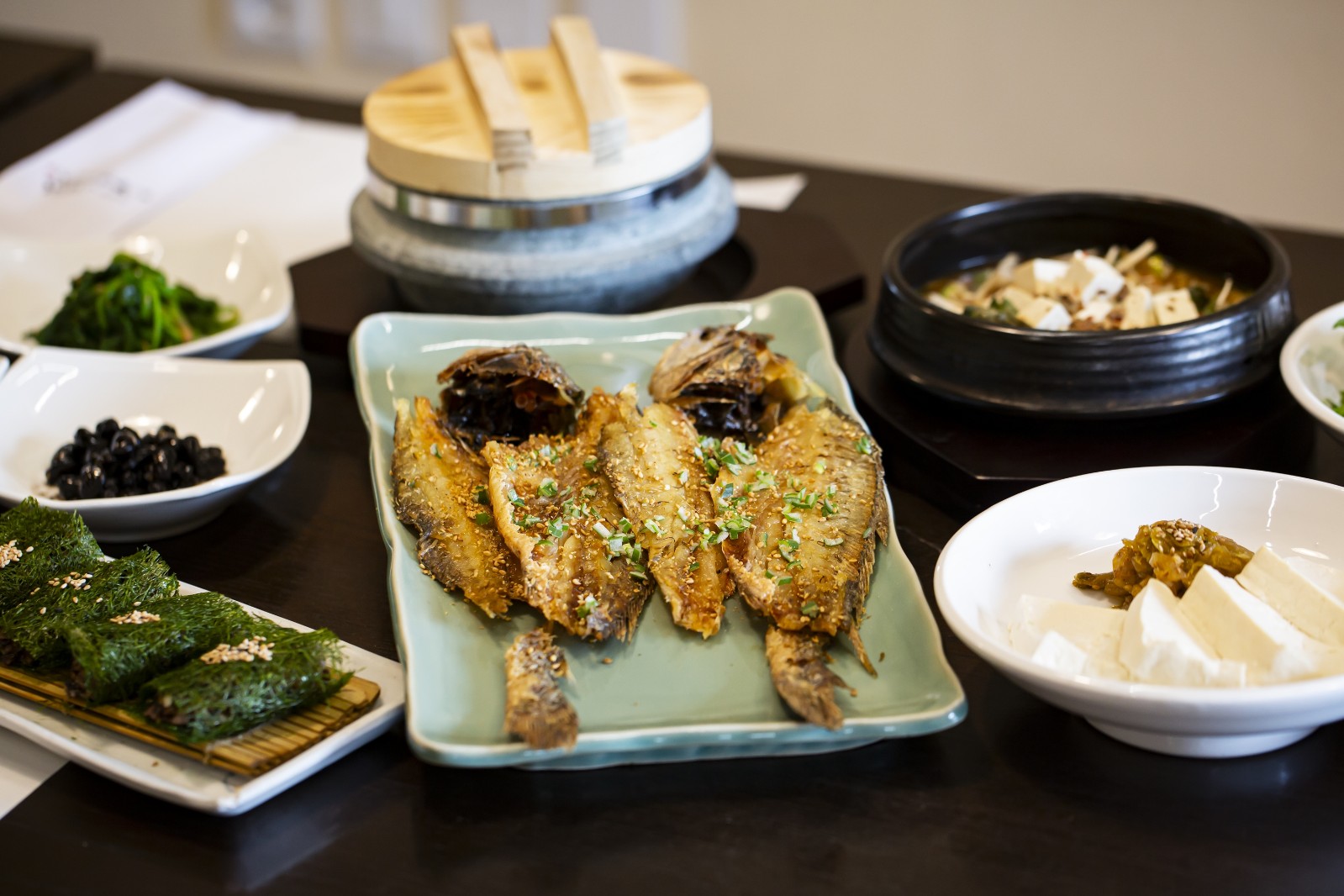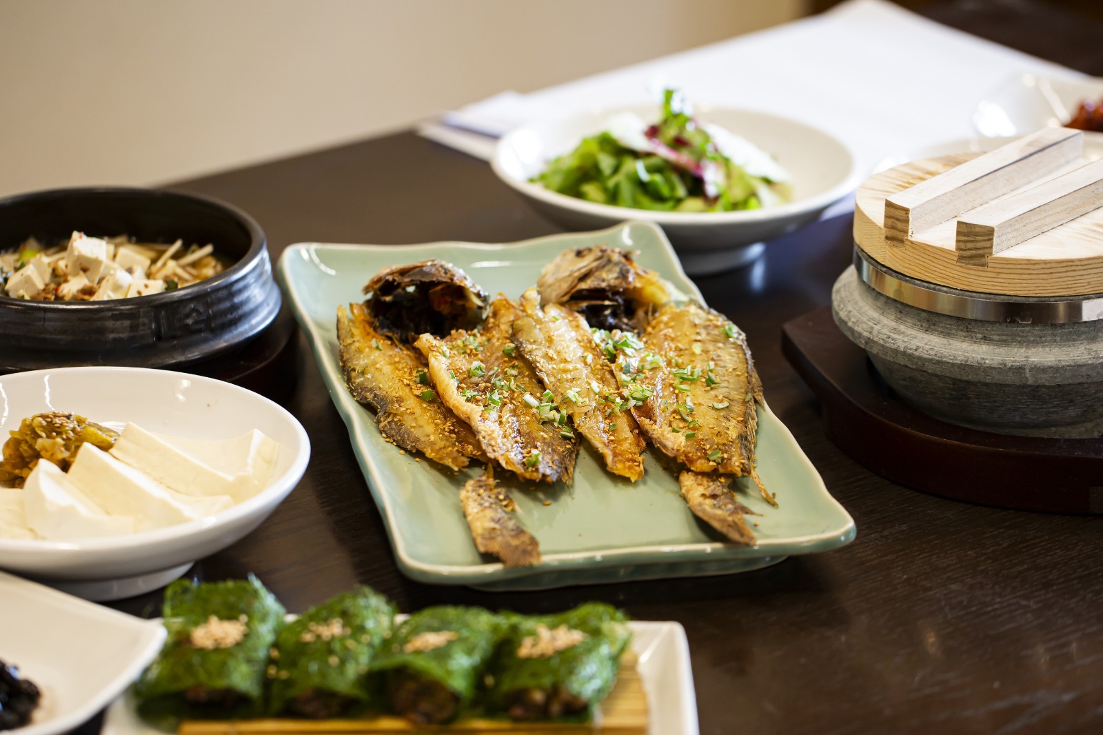 입맛 돋우는 전채요리를 시작으로 활어회, 갈비찜, 황태요리, 보리굴비 등의 굵직한 요리, 정갈한 밑반찬과 된장, 솥밥이 차례로 내어진다.